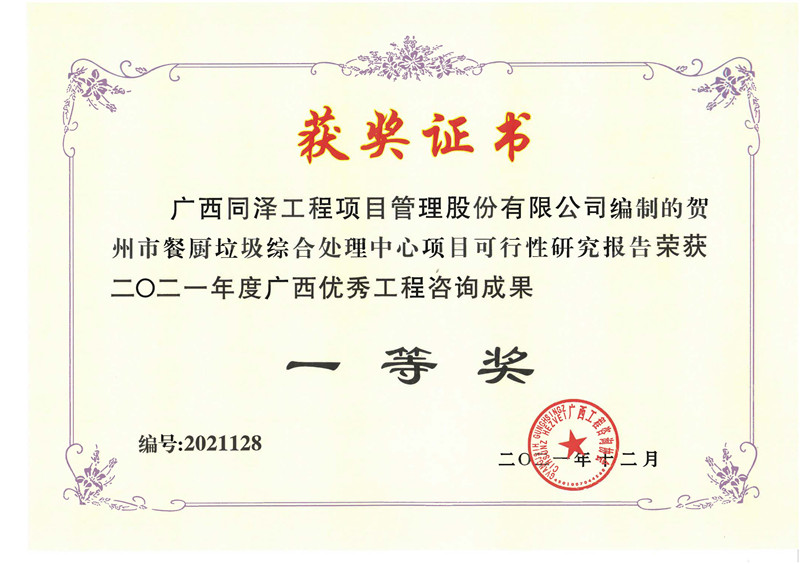 賀州市餐廚垃圾綜合處理中心項(xiàng)目榮獲2021年度廣西優(yōu)秀工程咨詢成果一等獎(jiǎng)