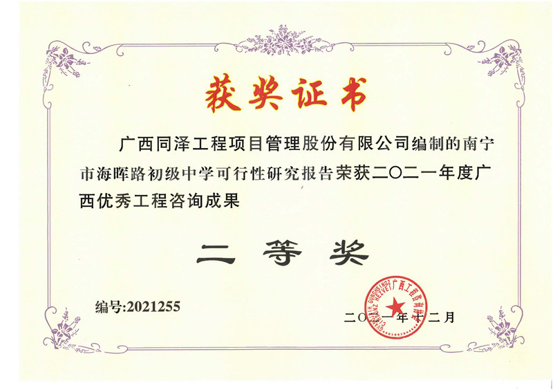 南寧市海暉路初級(jí)中學(xué)可行性研究報(bào)告榮獲2021年度廣西優(yōu)秀工程咨詢成果二等獎(jiǎng)