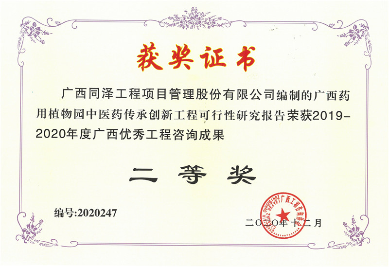 廣西藥用植物園中醫(yī)藥傳承創(chuàng)新工程可行性研究報(bào)告榮獲2019-2020年度廣西優(yōu)秀工程咨詢成果二等獎(jiǎng)
