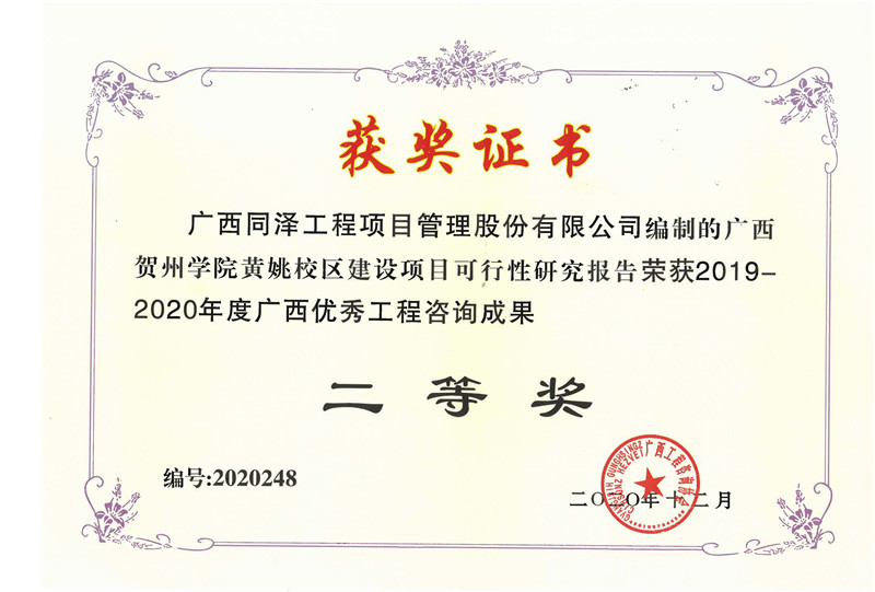 廣西賀州學(xué)院黃姚校區(qū)項(xiàng)目可行性研究報(bào)告榮獲2019-2020年度廣西優(yōu)秀工程咨詢成果二等獎(jiǎng)