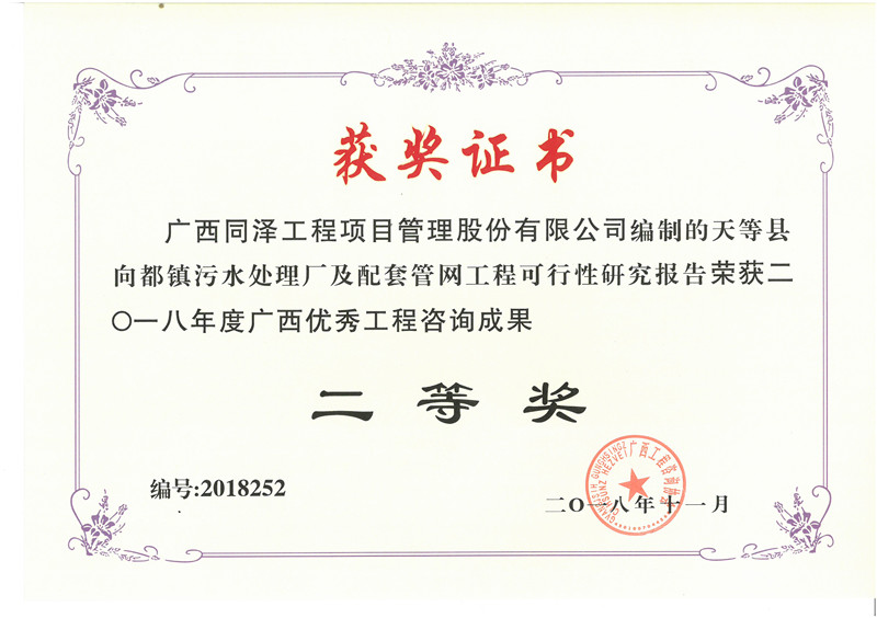 天等縣向都鎮(zhèn)污水處理廠及配套管網(wǎng)工程可行性研究報(bào)告榮獲2018年度廣西優(yōu)秀工程咨詢成果二等獎(jiǎng)