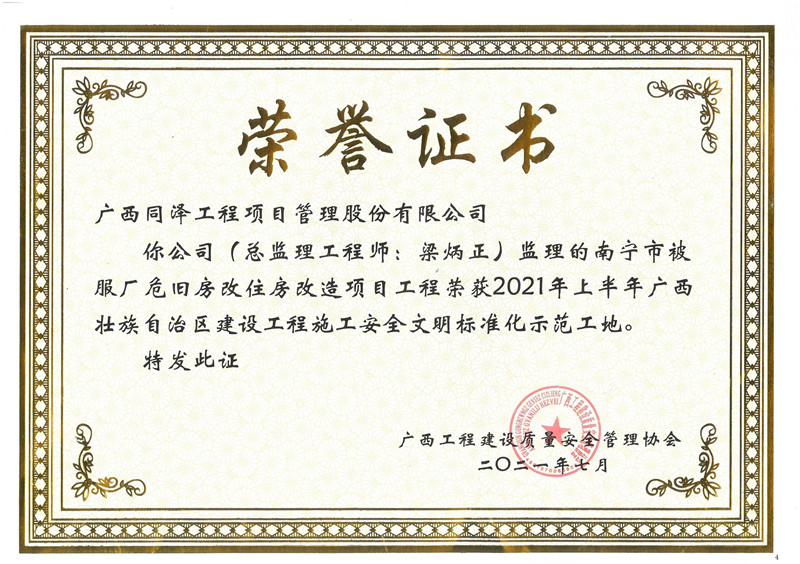 南寧市被服廠危舊房改住房改造項目榮獲2021年度安全文明標(biāo)準化工地