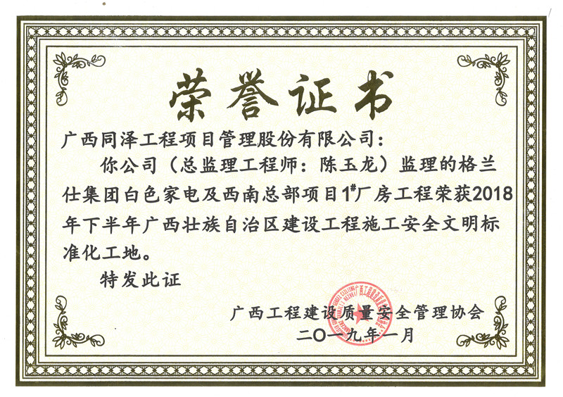 格蘭仕集團白色家電及西南總部項目榮獲2018年度安全文明標(biāo)準化工地