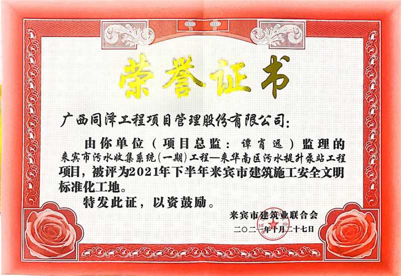 來賓市污水收集系統(tǒng)(一期)工程——來華南區(qū)污水提升泵站工程榮獲2021年度安全文明標(biāo)準化工地