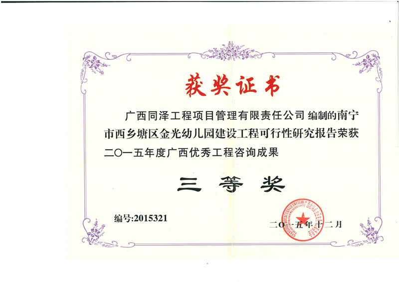 南寧市西鄉(xiāng)塘區(qū)金光幼兒園建設(shè)工程可行行研究報(bào)告榮獲2015年度廣西優(yōu)秀工程咨詢成果三等獎(jiǎng)