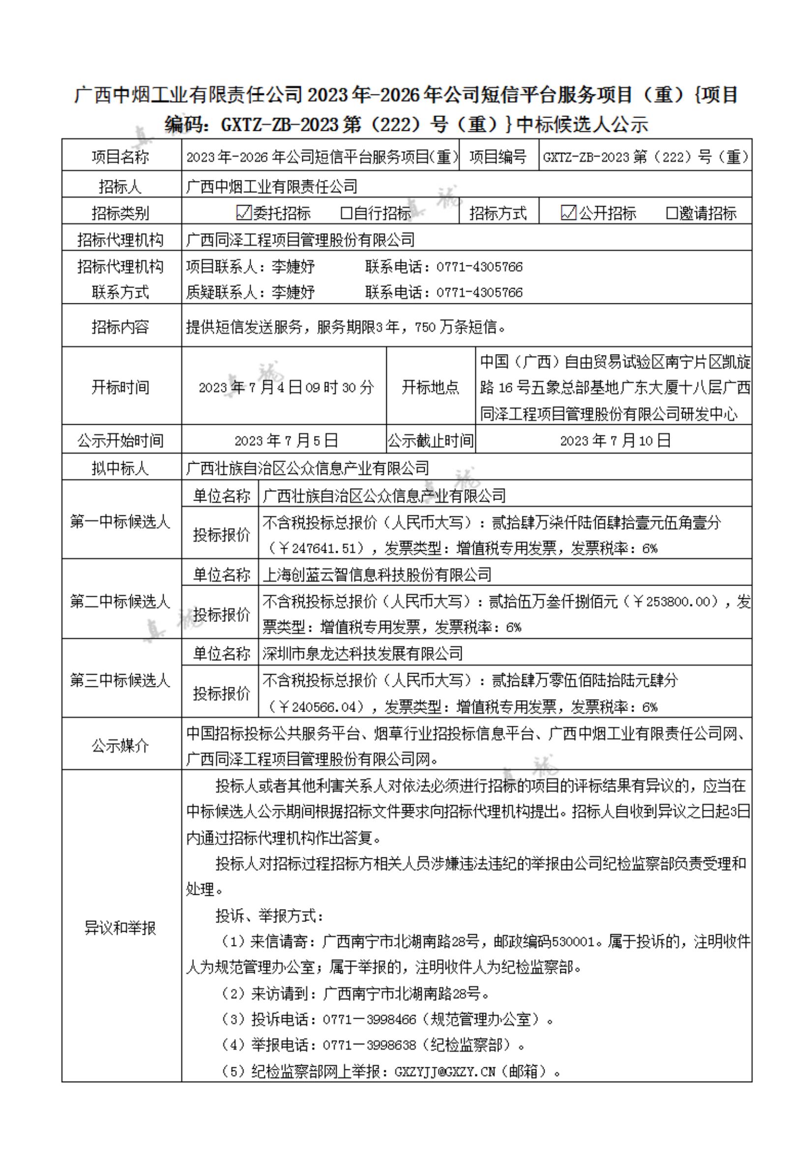 廣西中煙工業(yè)有限責(zé)任公司2023年-2026年公司短信平臺(tái)服務(wù)項(xiàng)目(重){項(xiàng)目編碼:GXTZ-ZB-2023第(222)號(hào)(重)}中標(biāo)候選人公示