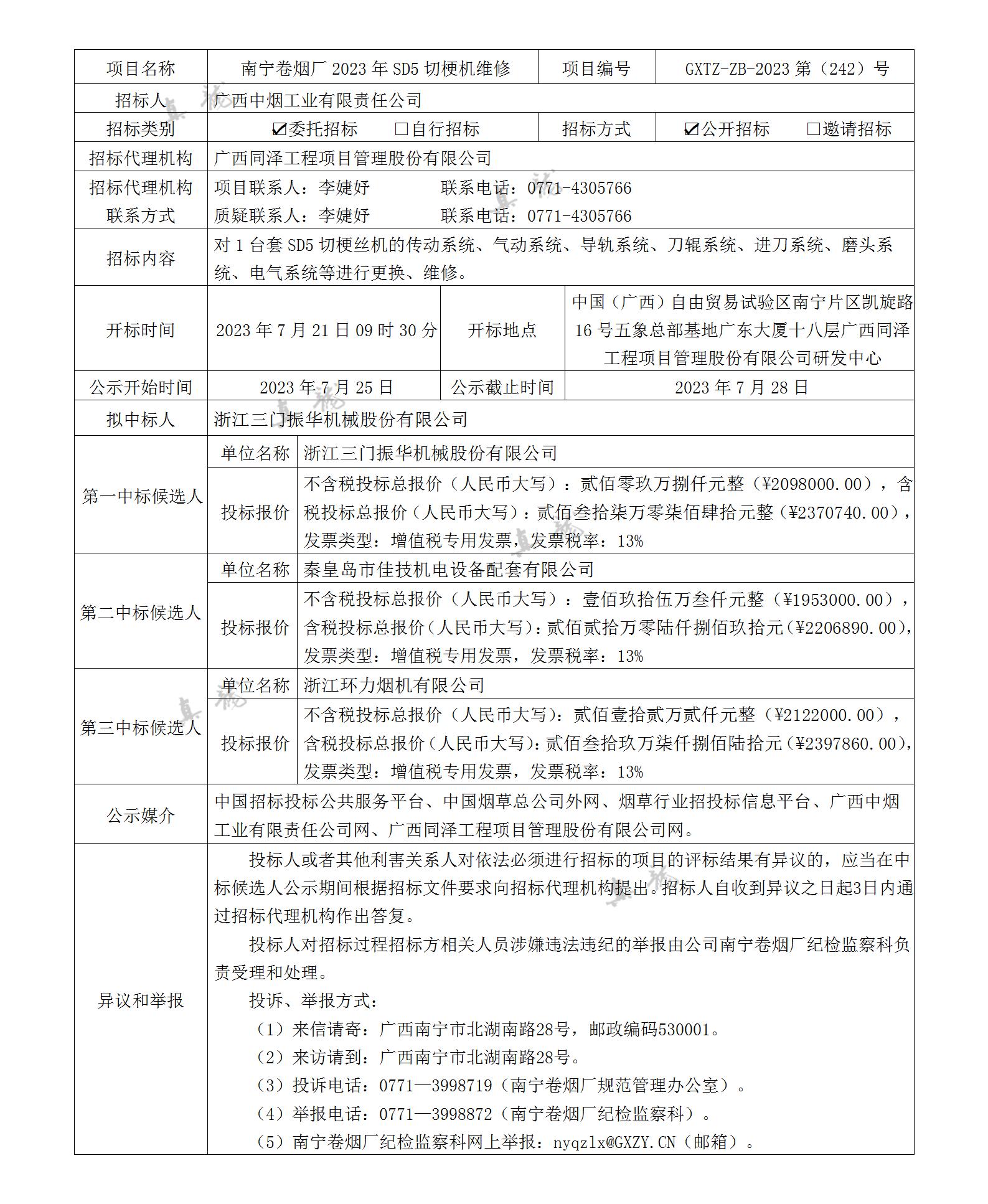 廣西中煙工業(yè)有限責任公司南寧卷煙廠2023年SD5切梗機維修(項目編號:GXTZ-ZB-2023第(242)號)中標候選人公示