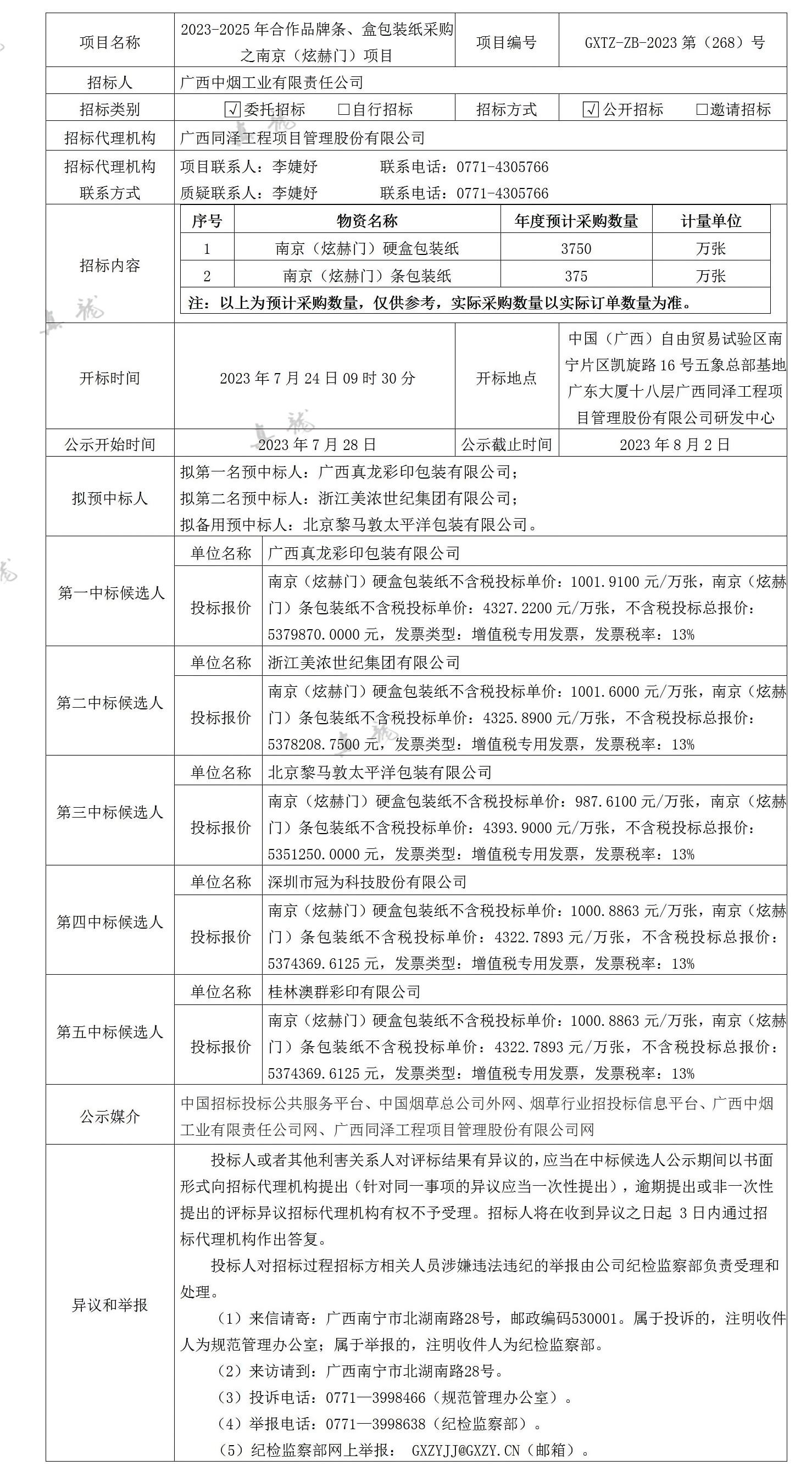 廣西中煙工業(yè)有限責(zé)任公司2023-2025年合作品牌條、盒包裝紙采購之南京(炫赫門)項目(項目編號:GXTZ-ZB-2023第(268)號)中標(biāo)候選人公示