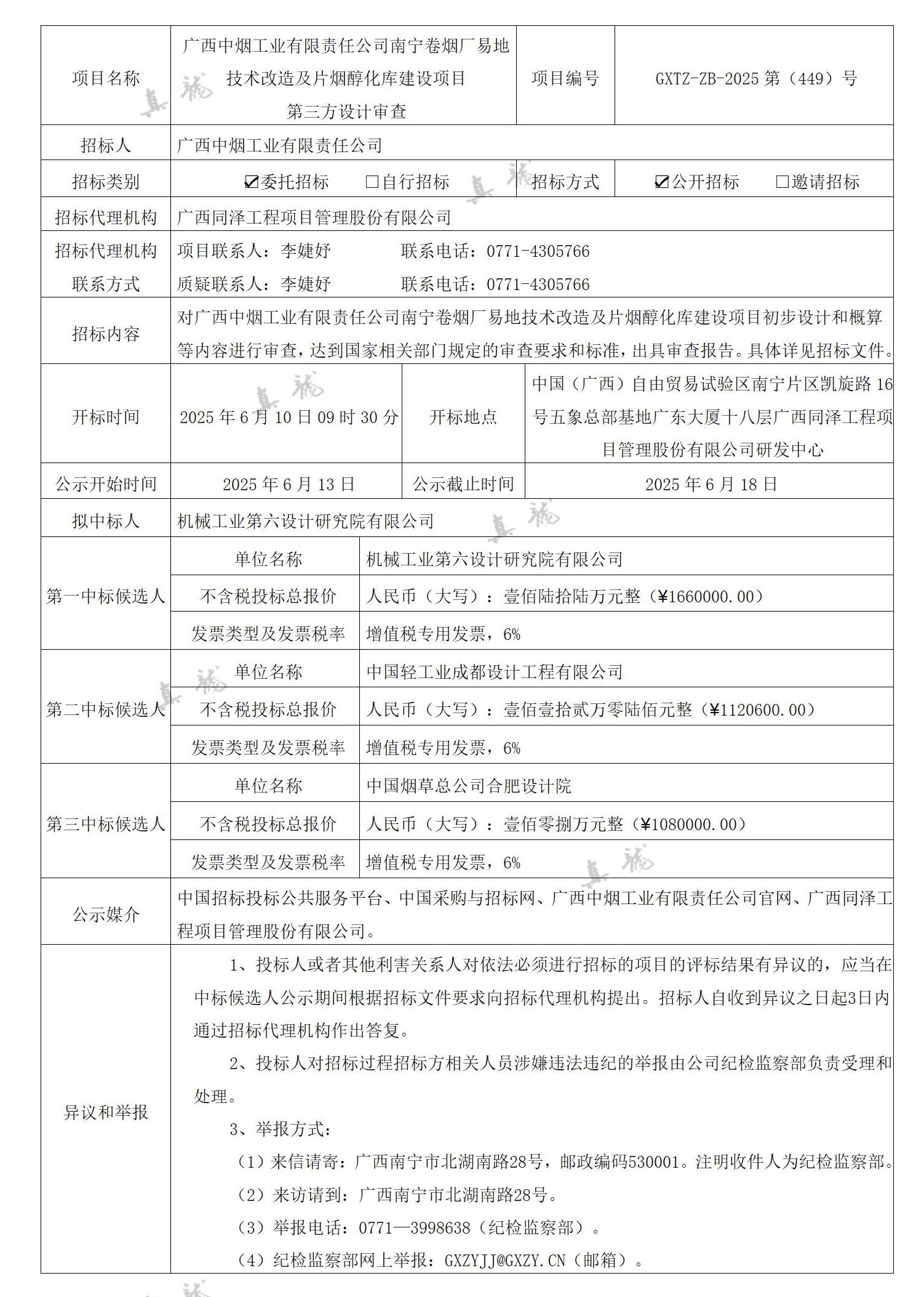 廣西中煙工業(yè)有限責(zé)任公司南寧卷煙廠易地技術(shù)改造及片煙醇化庫建設(shè)項(xiàng)目第三方設(shè)計(jì)審查(項(xiàng)目編號(hào):GXTZ-ZB-2025第(449)號(hào))中標(biāo)候選人公示