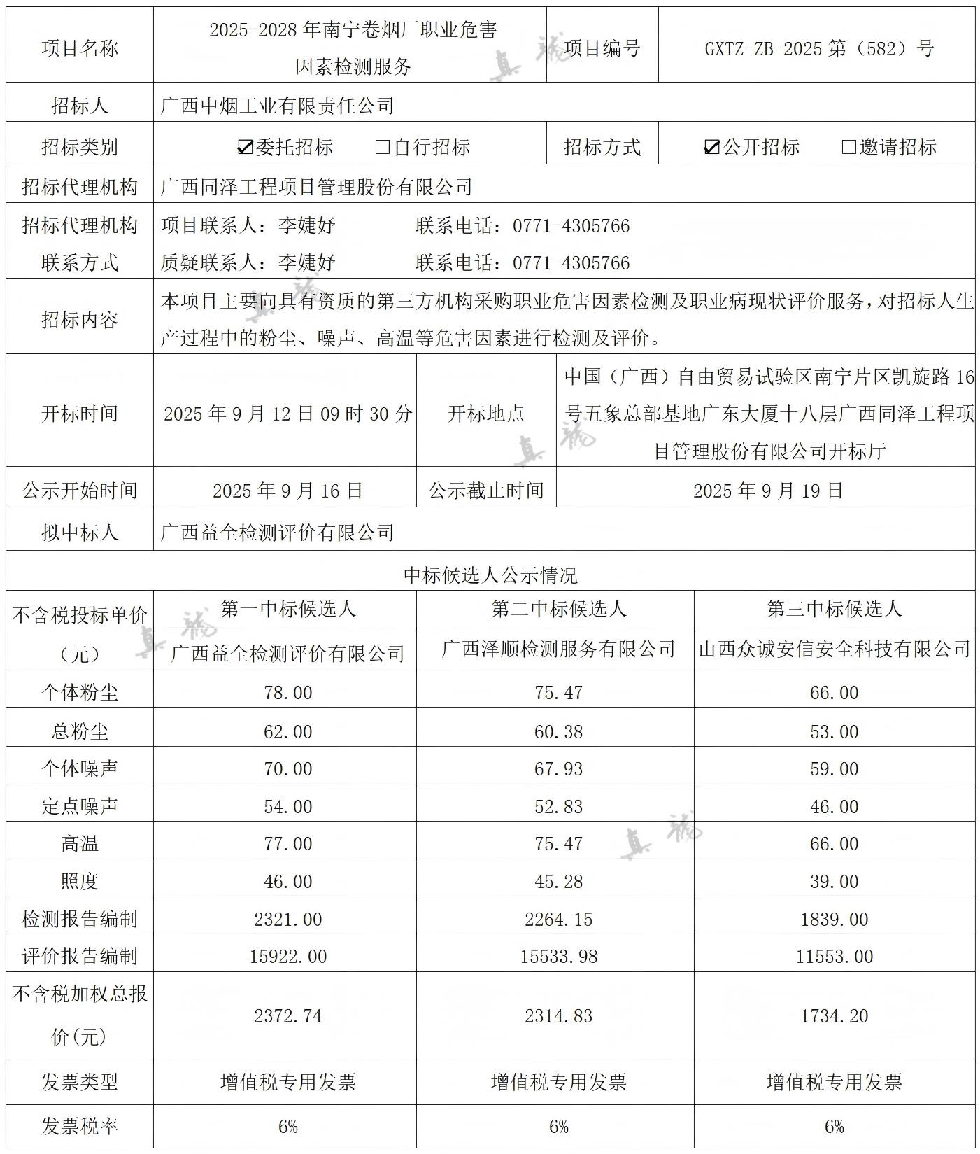廣西中煙工業(yè)有限責(zé)任公司2025-2028年南寧卷煙廠職業(yè)危害因素檢測服務(wù)(項(xiàng)目編號(hào):GXTZ-ZB-2025第(582)號(hào))中標(biāo)候選人公示