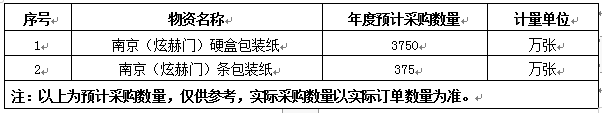 4、南京(炫赫門)硬盒包裝紙不含稅中標價:1001.7550元/萬張,南京(炫赫門)條包裝紙不含稅中標價:4326.5550元/萬張,發(fā)票類型:增值稅專用發(fā)票,發(fā)票稅率:13%。